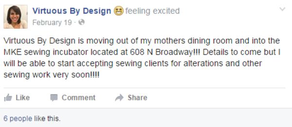 For Iris, Kiva Zip is also a great way to connect with people. Her 122 lenders are from all over the States and as far as Kenya, Germany, and Taiwan. She is thrilled to update them on her business’s progress in the coming months. And who would have thought she would now be renting a studio space out of Terry’s MKE Fashion Incubator? The space has not only enabled her to serve alteration and custom clients but also opened up the opportunity for her to teach a beginner sewing class and private sewing lessons. Moreover, the relationships she has formed with Terry and other local designers in Milwaukee are invaluable both personally and professionally.