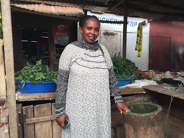 Last year she decided to take out a loan and invest in a cassava leaf grinder. She had the idea of not only using the grinder herself but also renting it out to other market vendors so that she can bring in extra income to pay for her children’s school fees.